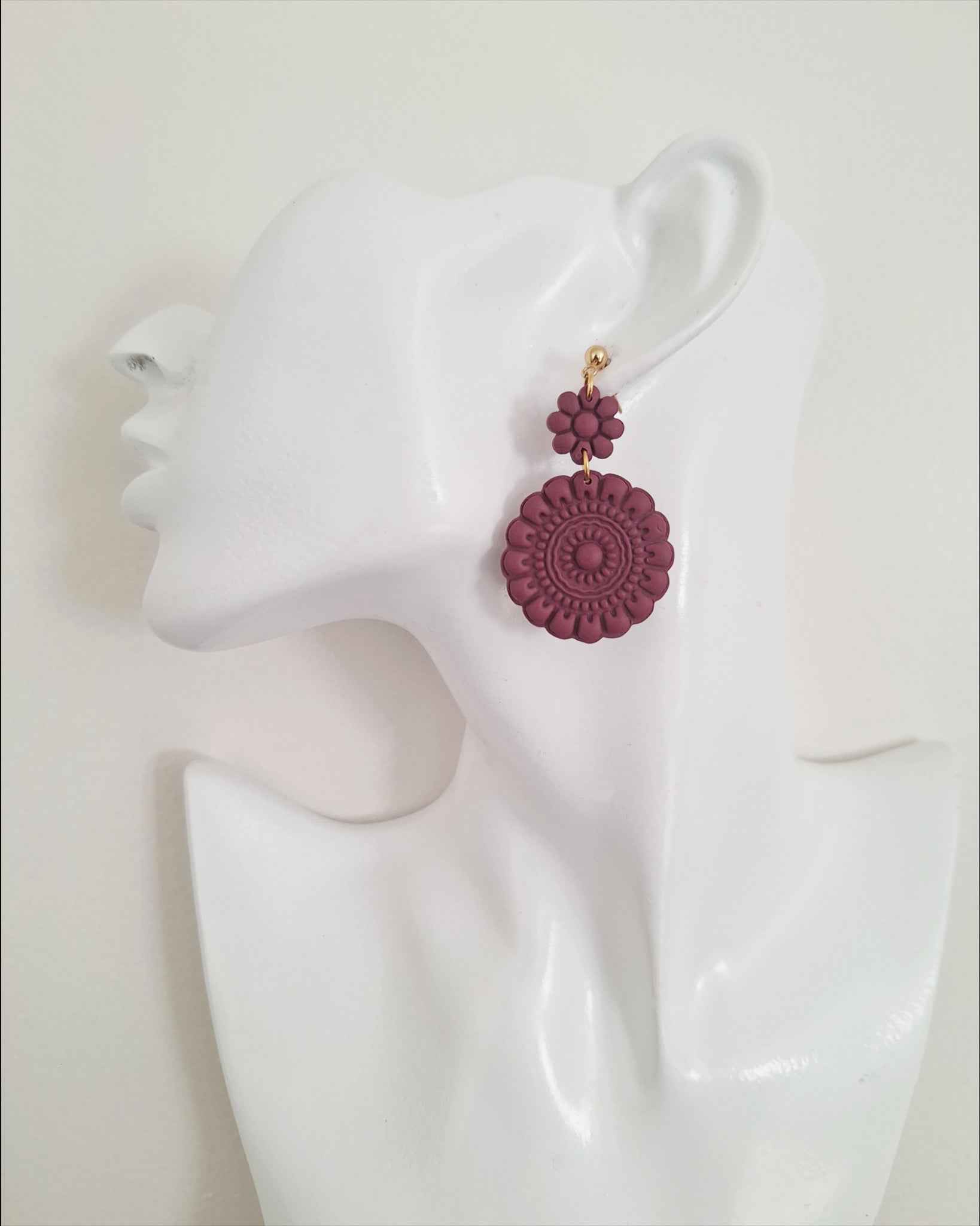 Burgundy textured mandela style earrings with flower detail on gold ball studs