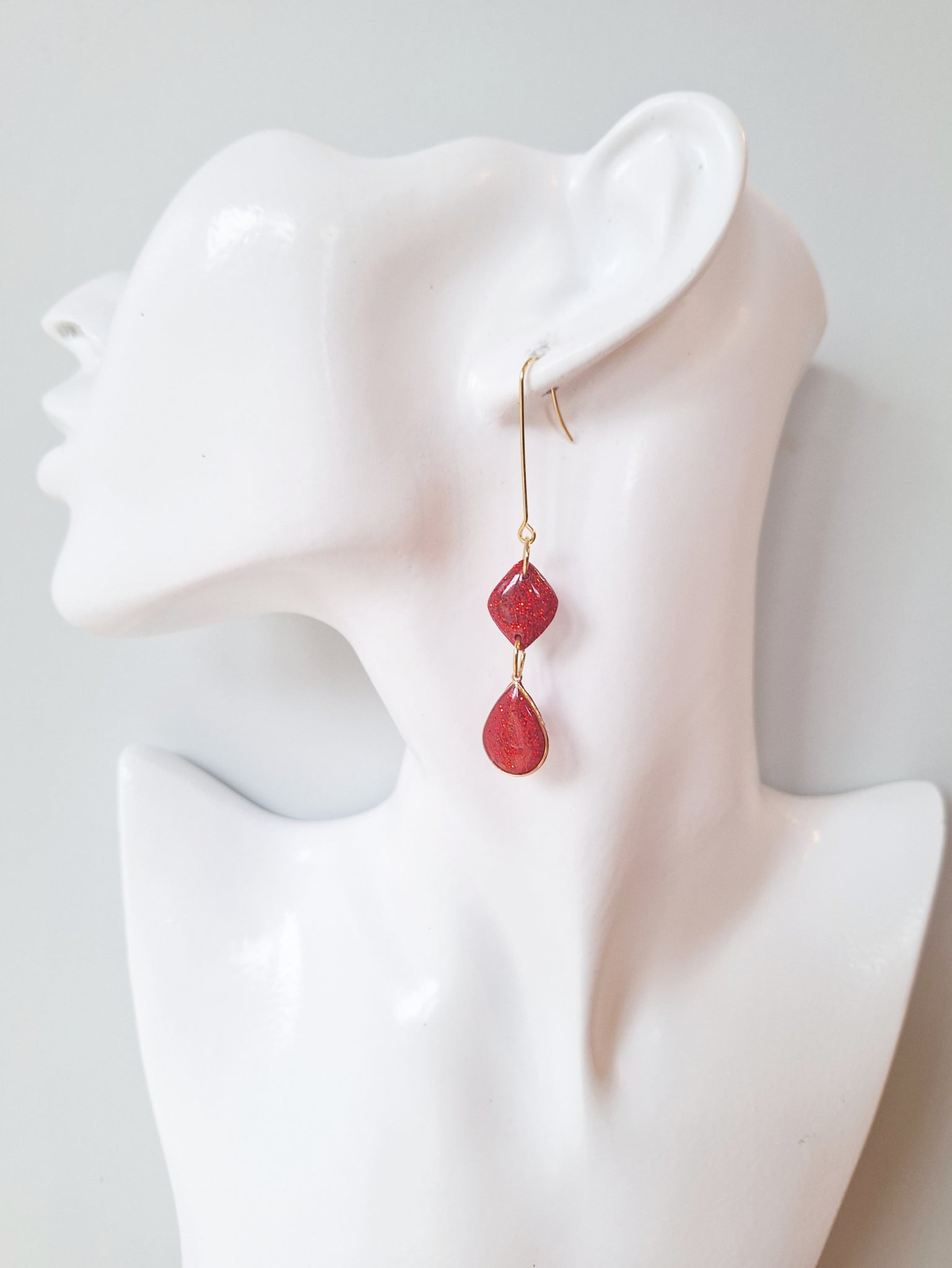 Red glitter drop earrings on extra long hooks