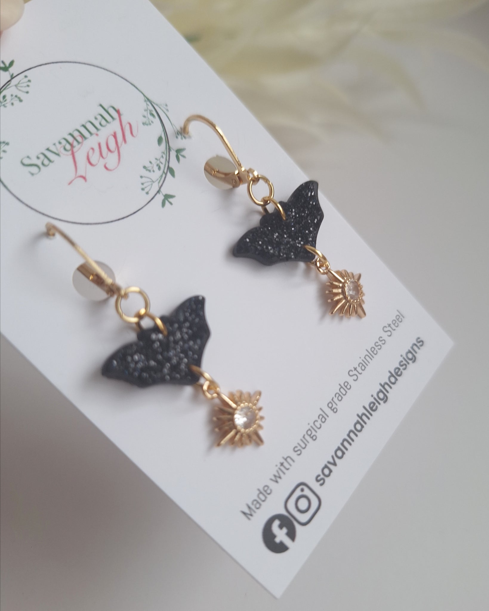 Black glitter bats with gold diamante detail on lever back gold hoops