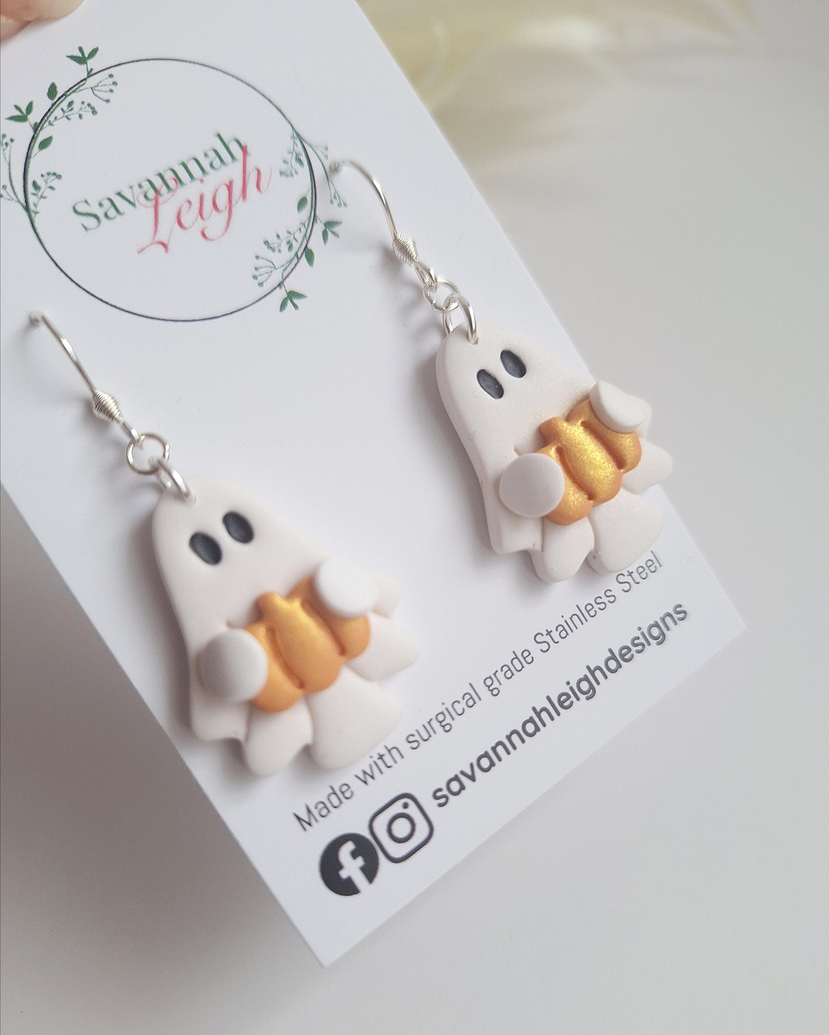 Ghost earrings with cute shimmer pumpkins on silver hooks